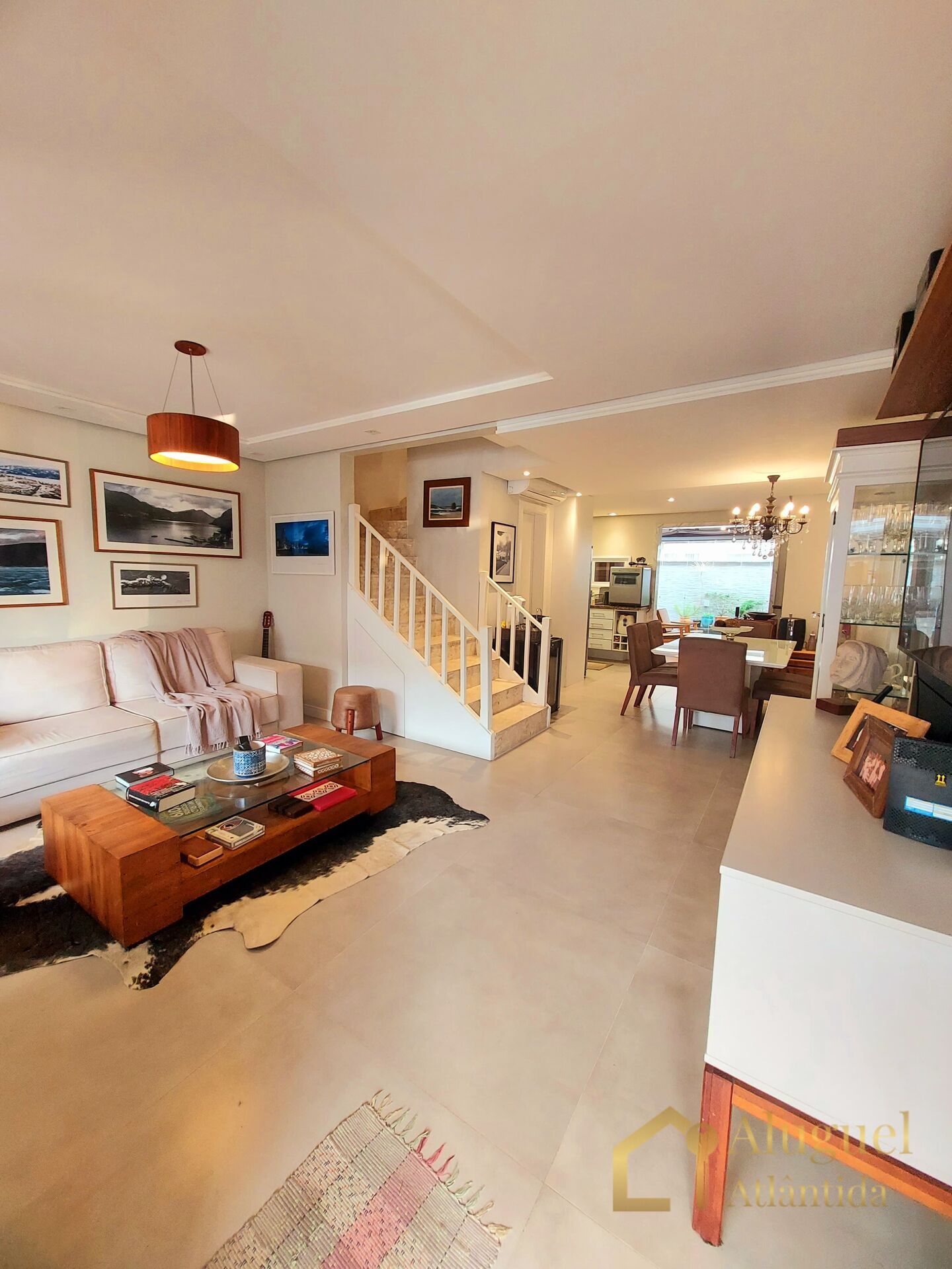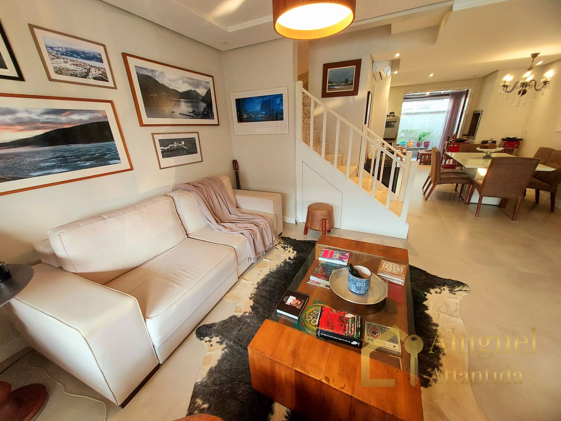 Sobrado com 03 dormitórios, sendo 01 suíte, banho social, lavabo, living amplo em 03 ambientes, cozinha americana, churrasqueira, lavanderia, totalmente climatizada.